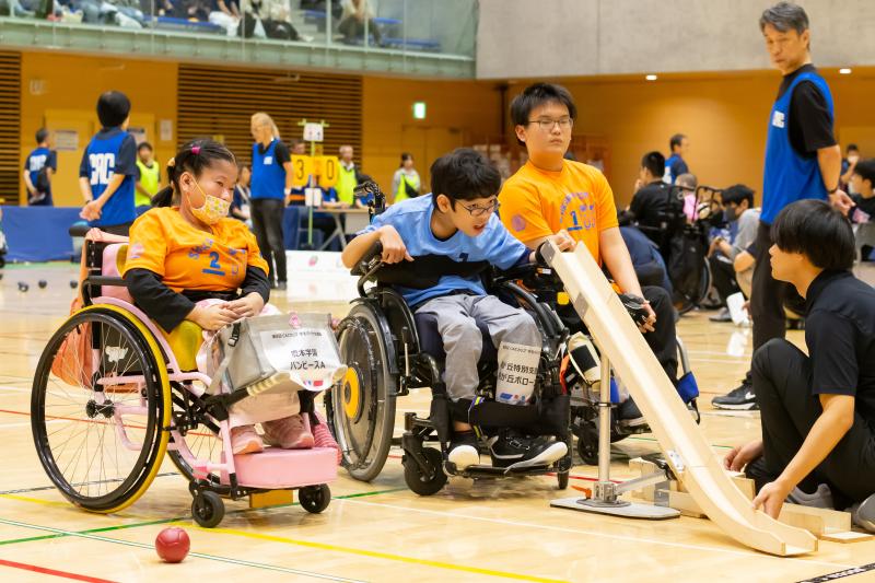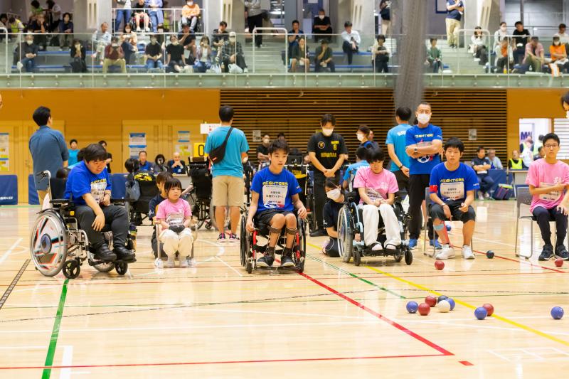 試合はボッチャカラー(赤、青、白)に彩られた入場門と、華やかに足元を照らすパネル上の入場行進から始まり、試合中は選手たちの表情とともにジャックボールと呼ばれる白い的玉の周辺を映した映像が会場を盛り上げました。空きコートを活用した交流試合も行い、参加者全員が存分に楽しんだ1日となりました。