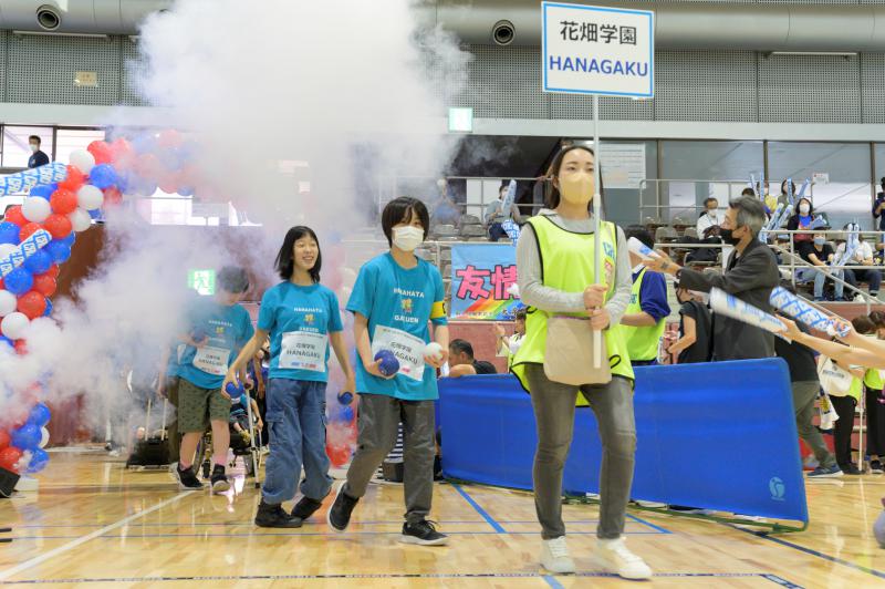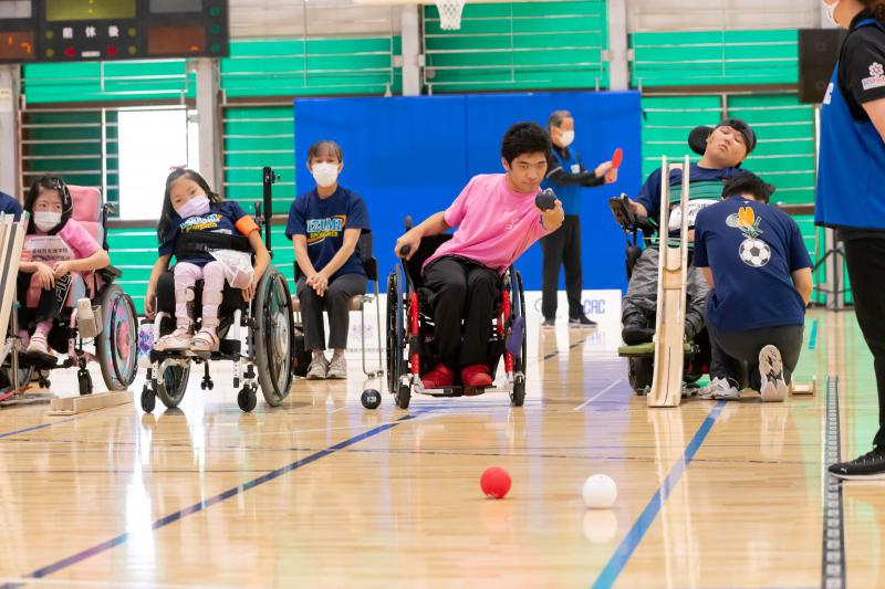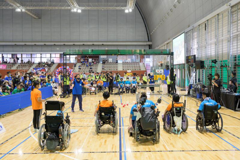 試合は、ジェットスモークの演出とともにボッチャカラー(赤、青、白)で彩られた入場門を選手たちがくぐる入場行進から始まり、試合中は選手たちの表情とともにジャックボールと呼ばれる白い的玉の周辺を写した映像が会場を盛り上げました。空きコートを活用した交流試合も行い、参加者全員が存分に楽しんだ1日となりました。